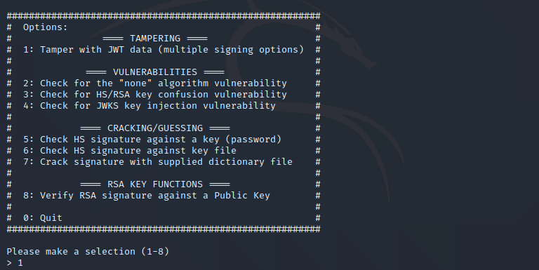 Next, I need to find out what jwt vulnerability can be used here so we can sign the value without knowing the private key, in this case, the best option is the “Sign with HS/RSA key confusion vulnerability”, so type 4 and hit enter.
